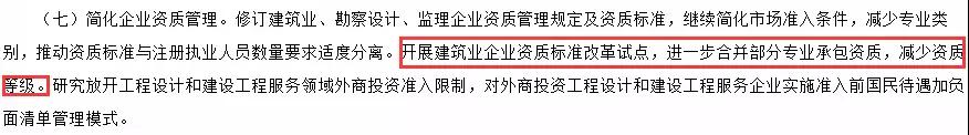 《2018年工作要點》中明確表示:繼續(xù)簡化市場準(zhǔn)入條件,減少專業(yè)類別;開展建筑業(yè)企業(yè)資質(zhì)標(biāo)準(zhǔn)改革試點,進一步合并部分專業(yè)承包資質(zhì),減少資質(zhì)等級。